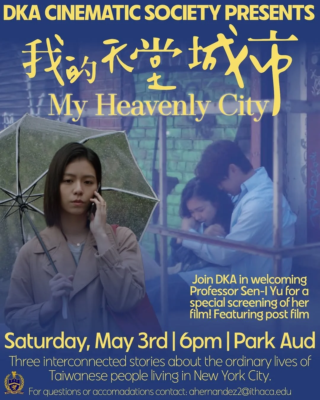 Join us THIS SATURDAY 5/3 @ 6pm in PARK AUDITORIUM for a screening of Professor Sen-I Yu’s film My Heavenly City! Free screening open to all students featuring pre-screening film history and post-screening discussion!